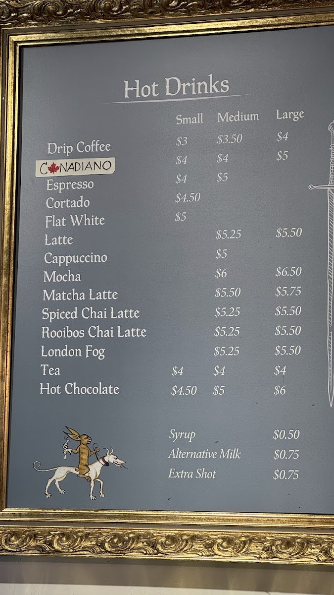 Cafe Duello’s menu strikes a playful balance between indulgence and creativity, offering a range of treats and beverages that cater to every taste. Their smoothie selection features options like Broadsword Berry Blast, Nicoletto's Nutty Chocolate Banana, Privateers Pineapple Sunset, The Green Knight, and Chainmail Chocolate Chai, each promising a vibrant, flavorful start to the day. For pastry lovers, the lineup includes classics such as Croissant - Almond, Cruffin - Vanilla, Pain Au Chocolate, Cinnamon Loaf, and Cookie - Chocolate Chip, all elegantly baked and visually inviting. The Feature Drinks, including Vanilla Maple Latte, Teddy Graham Latte, and Salted Caramel Hot Chocolate, add a cozy, whimsical twist to traditional café beverages. The coffee and tea offerings are robust yet approachable, featuring Canadiano, Canadiano Misto, Cortado, Matcha Latte, and Hot Chocolate, while the beverage section rounds things out with lighter options like Gatorade, Bubly, and Blue Monkey Zevia. Health-conscious diners and those with dietary restrictions are well-served with GF/Vegan Cookies and Bars, including S'mores Bar (DF, GF, NF), Oat Bar (GF, V, NF), Lemon Blondie (GF, DF, NF), and Cookie - Double Chocolate (GF, V). On the savory side, the menu offers hearty, satisfying choices such as Grilled Cheese (GF), Hummus & Roasted Veg Bagel, Basil Tuna Bagel Melt, and the customizable Forge Your Own Bagel, ensuring a versatile experience that balances comfort and creativity. Overall, Cafe Duello’s menu reflects a thoughtful curation of bold flavors, classic favorites, and playful innovations, all served in a welcoming, approachable way.